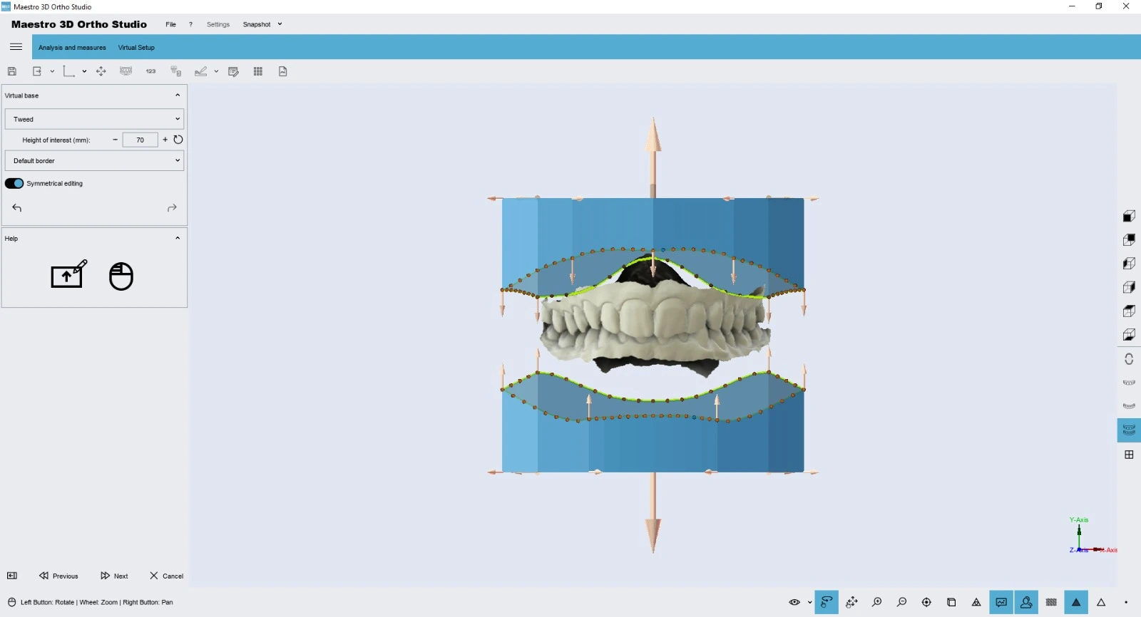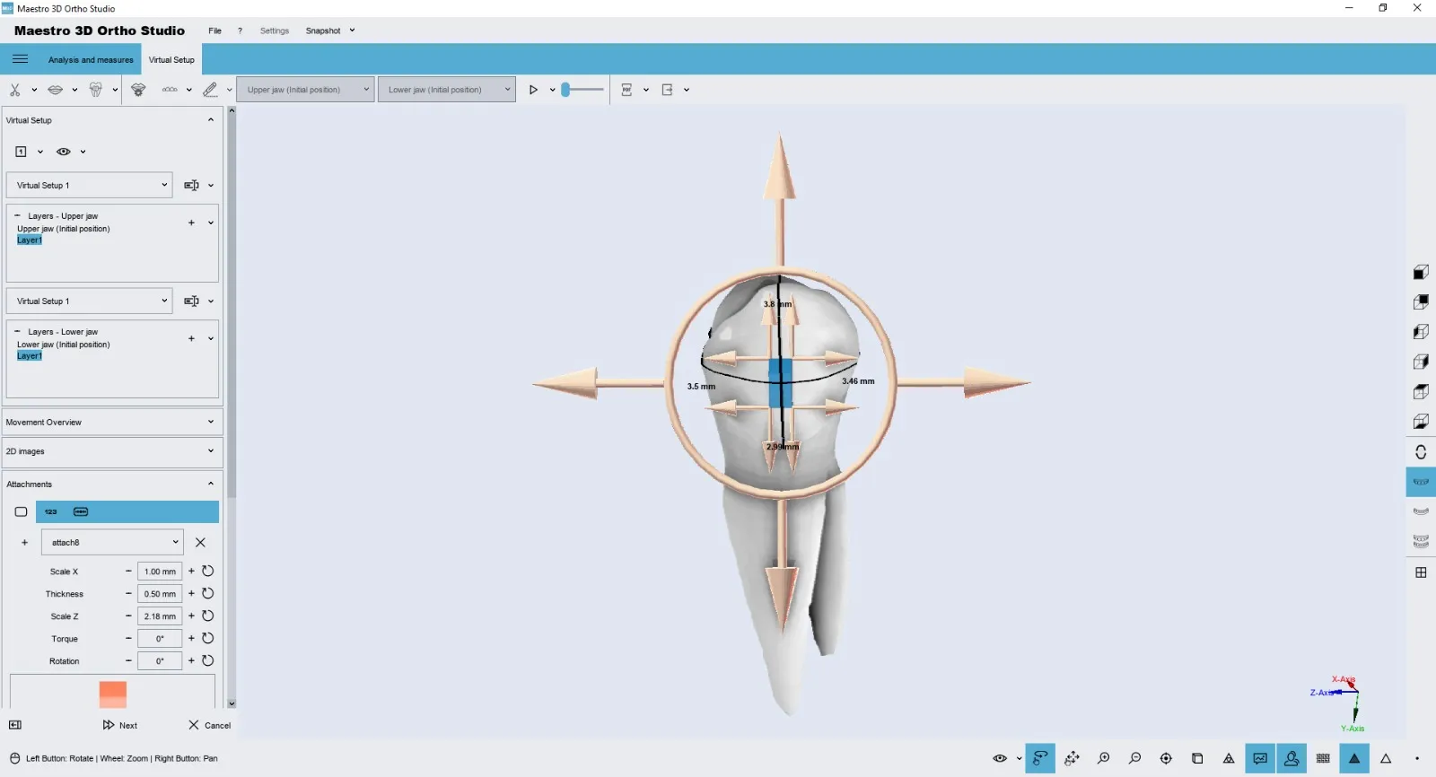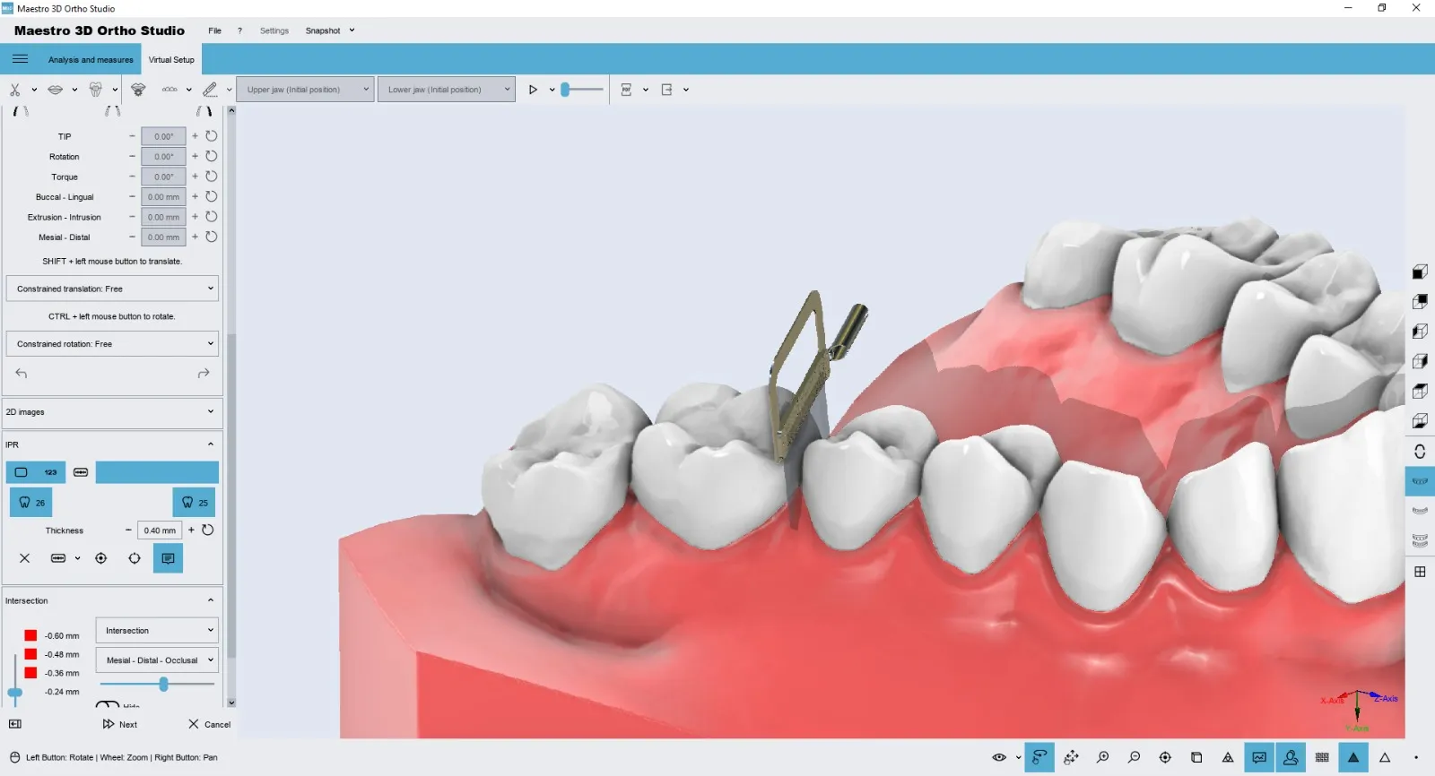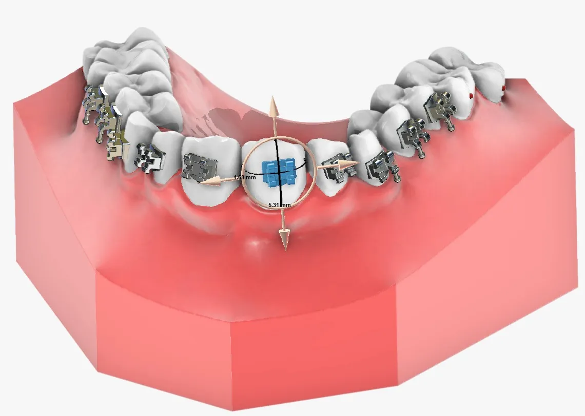 Allows tooth movement for both the arches, evaluating distances contacts and intersections. It also allows to add and customize attachments / labels (both positive or negative) and to perform teeth extractions and IPR (interproximal reduction).